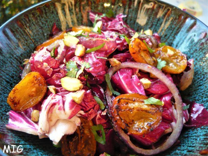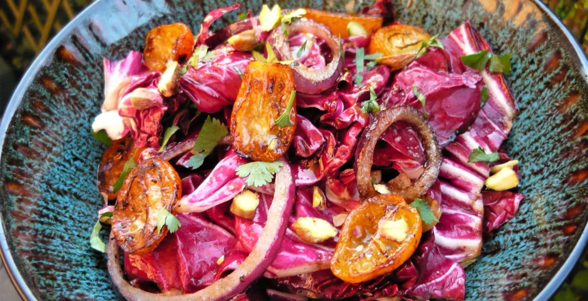 Répartissez la salade dans les assiettes, puis les kumquats et oignons encore chauds, saupoudrez des pistaches et de la coriandre.