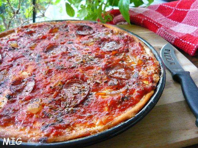 A Chicago, la tradition est de cuire cette pizza, dans une poêle qui va au four. J’ai utilisé une tourtière (24 cm de diamètre), qui fait parfaitement l’affaire, ses bords évasés permettant de démouler la bête en la faisant glisser, mais un moule à manquer est possible pourvu qu’on le tapisse de papier cuisson pour faciliter l’opération.