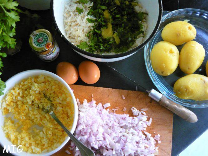 Ecrasez les oeufs à la fourchette, tout comme les pommes de terre, ciselez le persil et mélangez, avec les mains, avec la morue, l’oignon, l’ail haché finement, une cuillerée à café (+/- selon goût) de piment, liez avec les deux oeufs battus et les deux cuillérées à soupe d’huile d’olive.Goutez et rectifiez l’assaisonnement, si besoin (je n’ai pas arrêté pour arriver au résultat souhaité).