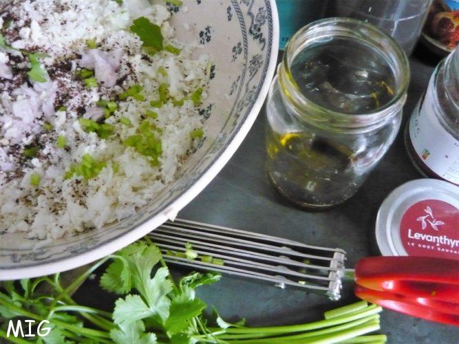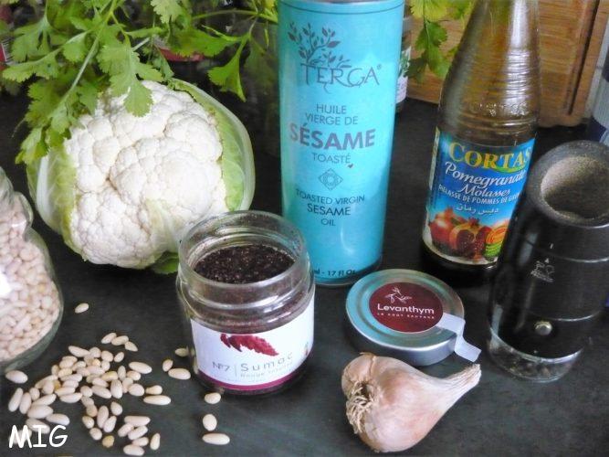 Ca fait un moment que je n’achète plus un chou-fleur mais deux : un pour le consommer cuit, et un autre pour faire un taboulé. C’est un plat tout simple, facile, léger mais calant. Il suffit juste d’avoir une bonne râpe ou, à défaut, un bon couteau, et comme pour tout, les bons ingrédients. Taboulé oblige, j’ai repris certains codes de la cuisine levantine, le sumac, la mélasse de grenade et le sésame, pas en version tahin, mais en huile.