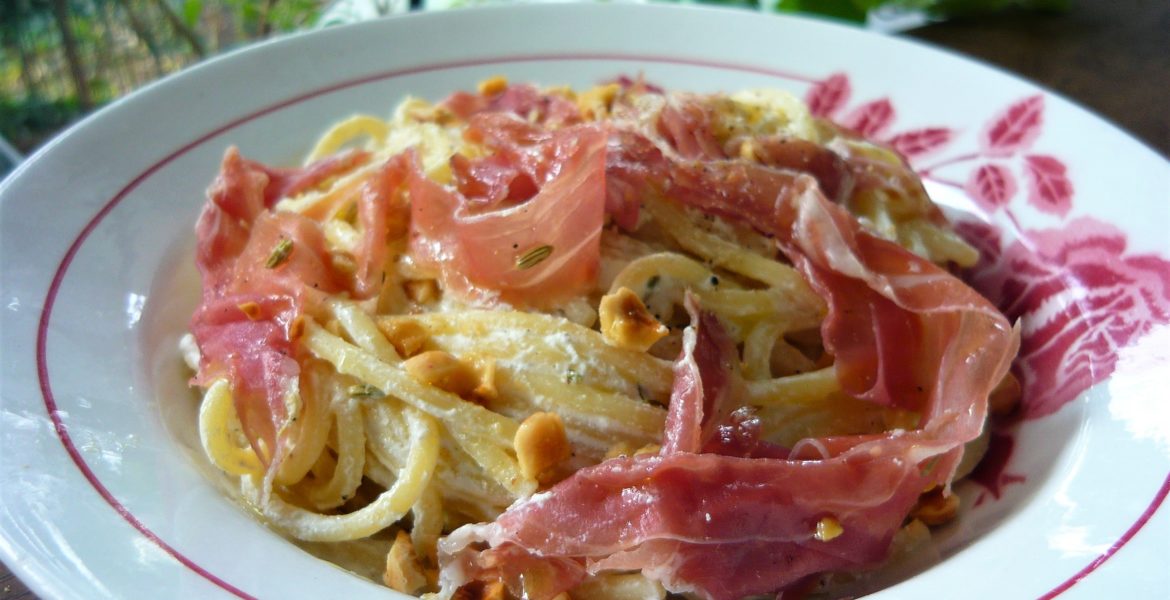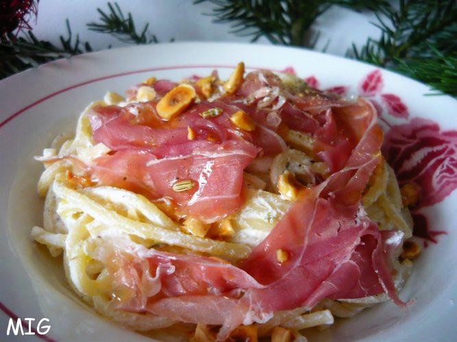 Par une froide journée d’hiver, j’avais à la fois envie de pâtes et de graines de fenouil (oui, je suis comme ça) . Les graines de fenouil, on les utilise surtout, côté sud, dans des recettes de poissons, et elles sont incontournables de certaines charcuteries italiennes. Je me suis donc amusée à rester dans les codes de la Botte et j’ai ajouté de la ricotta, mon jambon italien préféré et, pour le croustillant, des noisettes (j’en avais justement du Piémont). Recette express (le temps de cuisson des pâtes) validée par mes testeurs donc recette publiée.