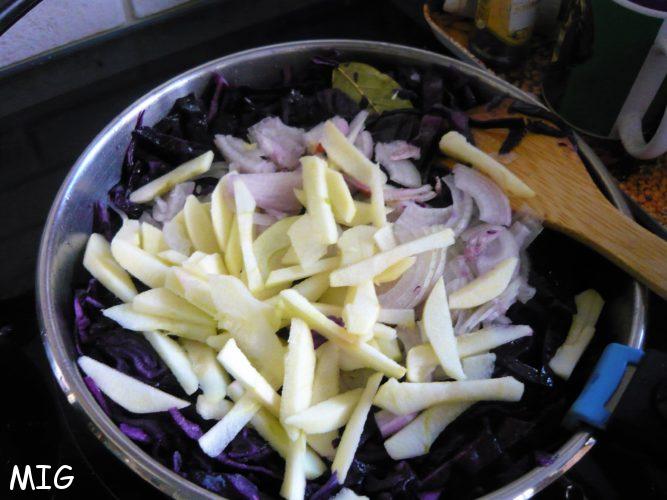Incorporez oignon et pommes au chou rouge, prolongez la cuisson en mélangeant doucement. Quand les pommes et l’oignon deviennent translucides, salez, poivrez généreusement, ajoutez la cannelle. J’en ai mis l’équivalent d’une demi cuillerée à café mais la mienne étant très parfumée, il vous en faudra peut-être plus. Prolongez la cuisson jusqu’à ce que tout soit ferme et fondant à la fois.