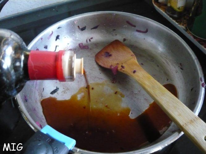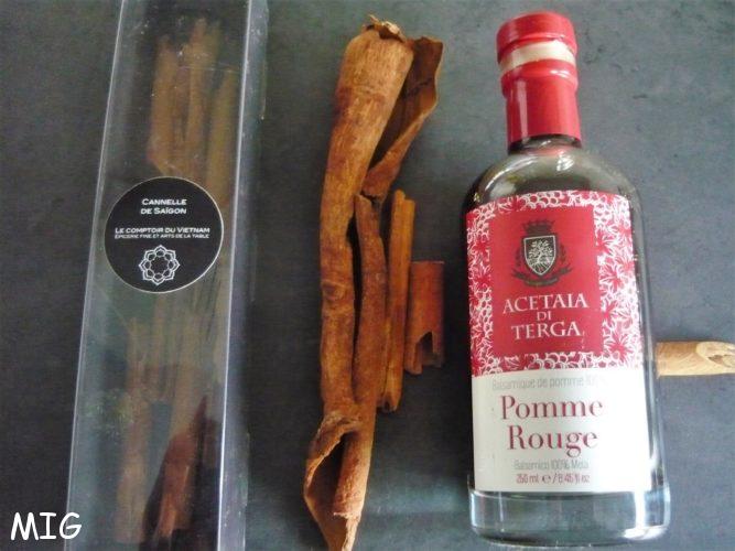 Ce qui lui apporte cette gourmandise, c’est le vinaigre balsamique de pommes (je dis bien « de », pas « aux » donc produit directement à partir de pommes, à ne pas confondre avec les vinaigres aromatisés ou celui de cidre) et la touche de cannelle qu’on ajoute à la fin de la cuisson.
