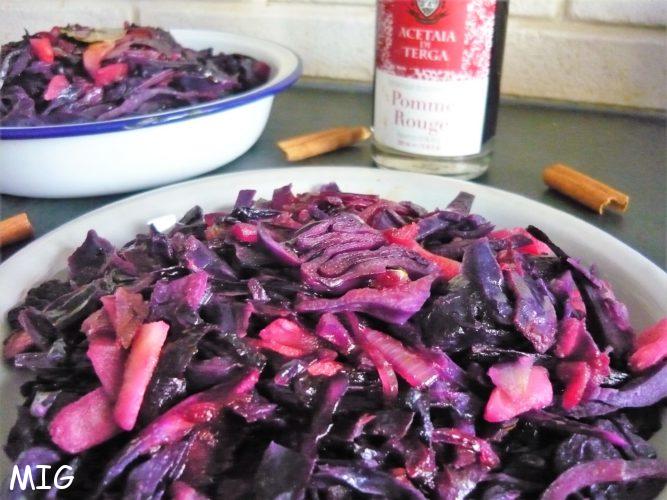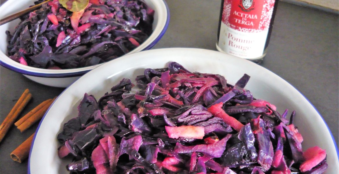 La poêlée de chou rouge aux pommes, ça n’est pas quelque chose de très original, mais deux ingrédients, en touche finale, font que j’aurais pu, comme pour les poireaux vinaigrette, l’appeler « la poêlée de chou rouge du reste de ta vie », parce que c’est la première fois que j’en fais une gourmande comme un dessert, grâce à deux ingrédients qui changent vraiment tout.