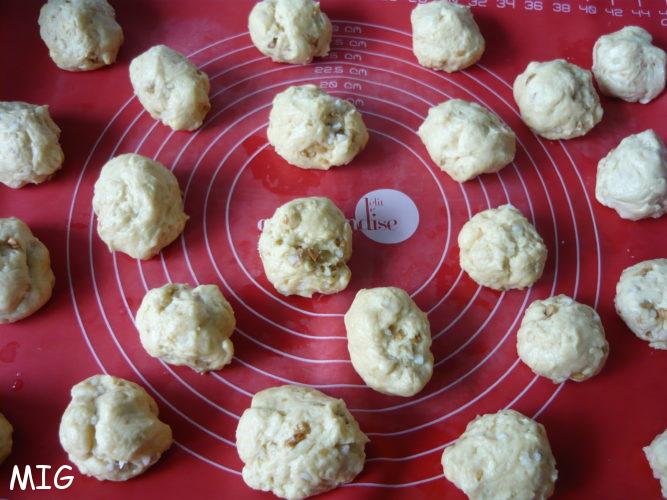Mouillez-vous les mains à l’eau froide pour former des boules que vous placez sur un plateau ou une plaque à pâtisserie recouverte de papier sulfurisé ou d’un tapis de silicone.