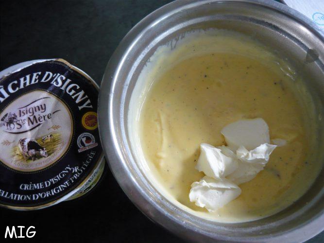 J’ai testé l’astuce du chef pour en accroître la finesse, à savoir l’ajout de crème fraîche épaisse. J’ai adoré car, au passage, ça lui apporte un peu de fraîcheur mais, on ne rigole pas, on prend, bien entendu, une vraie crème fraîche épaisse d’Isigny, on laisse les industrielles à ceux qui n’aiment pas la crème fraîche.