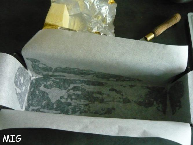Soit vous beurrez généreusement votre moule, soit, comme moi, vous le beurrez légèrement pour faire adhérer un papier de cuisson, que vous beurrez ensuite généreusement (3 fois « beurrez » et c’est pas fini…).