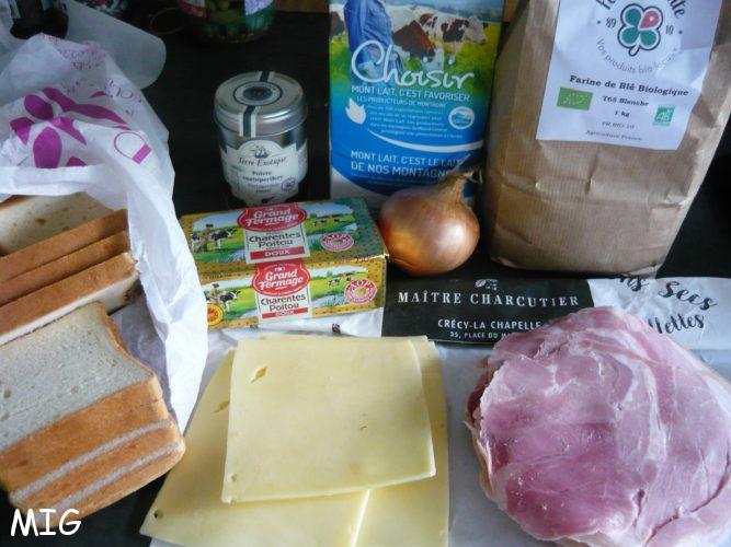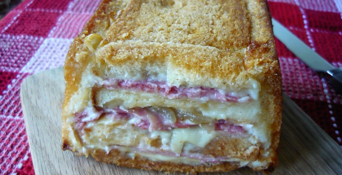 Je n’ai rien changé à la recette traditionnelle, les ingrédients sont identiques, excepté pour la petite touche d’oignon (facultative) ; seule la forme est modifiée. J’ai utilisé un moule à cake, mais on peut préférer un plat à gratin voire un moule à manquer. Il suffira, pour ce dernier, de couper les tranches de pain de mie et de fromage, en diagonale, pour obtenir des triangles à disposer en éventail.