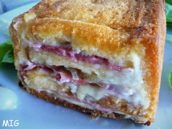 Un croque-monsieur en solo, c’est gourmand, un grand croque-monsieur à partager, c’est super gourmand. On peut le faire à l’avance et le réchauffer, entier ou en tranches, doucement (140°), au four traditionnel. Je me demande même si on ne peut pas l’emporter en pique-nique, en tranches, et lui donner un petit coup du même chalumeau que celui qui sert à la crème brulée ou à la meringue de la tarte au citron.