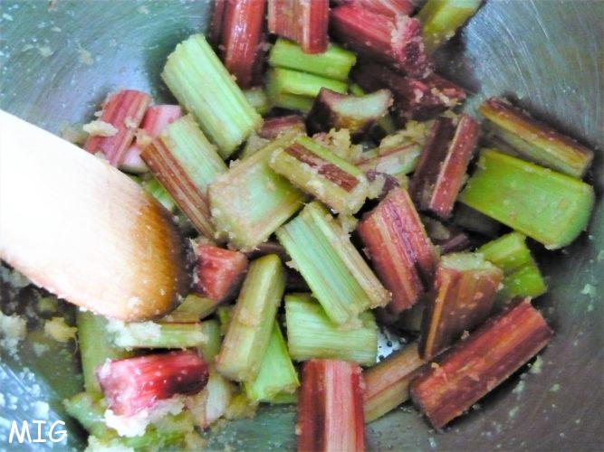 Epluchez (grattez-le simplement avec la lame d’un couteau) le gingembre et hachez-le (si vous avez une Microplane, il n’y a pas mieux) dans un saladier avant de le mélanger avec les deux cuillerées à soupe de sucre en poudre et d’en enrober complètement les tronçons de rhubarbe (n’hésitez pas à faire cela à l’avance, ça n’en sera que meilleur).