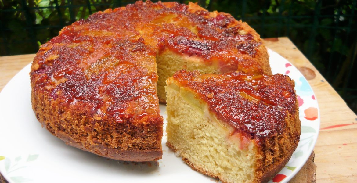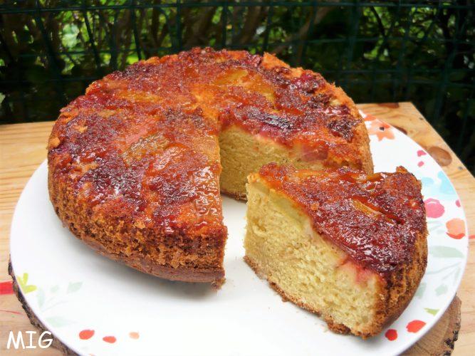 Disposez les tronçons de rhubarbe sur le fond du moule tapissé de caramel, versez l’appareil à gâteau et enfournez pour environ 40 mn. Il doit être bien gonflé, doré et la lame d’un couteau piquée dedans doit en ressortir sèche (il peut y avoir des traces d’humidité, dues à la rhubarbe et au caramel mais surtout pas de pâte).