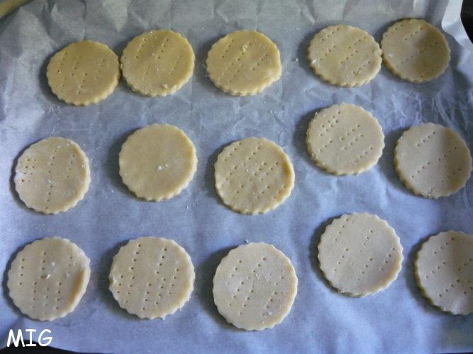Mélangez les poudres avant d’amalgamer avec le beurre. Abaissez au rouleau sur une hauteur d’environ 3 mm, découpez à l’aide d’un emporte-pièces (un verre à moutarde fera l’affaire) en répétant l’opération jusqu’à ce qu’il ne reste plus de pâte. Posez-les sur une plaque à pâtisserie, piquez-les avec une fourchette et réservez au frigo environ une demi-heure.