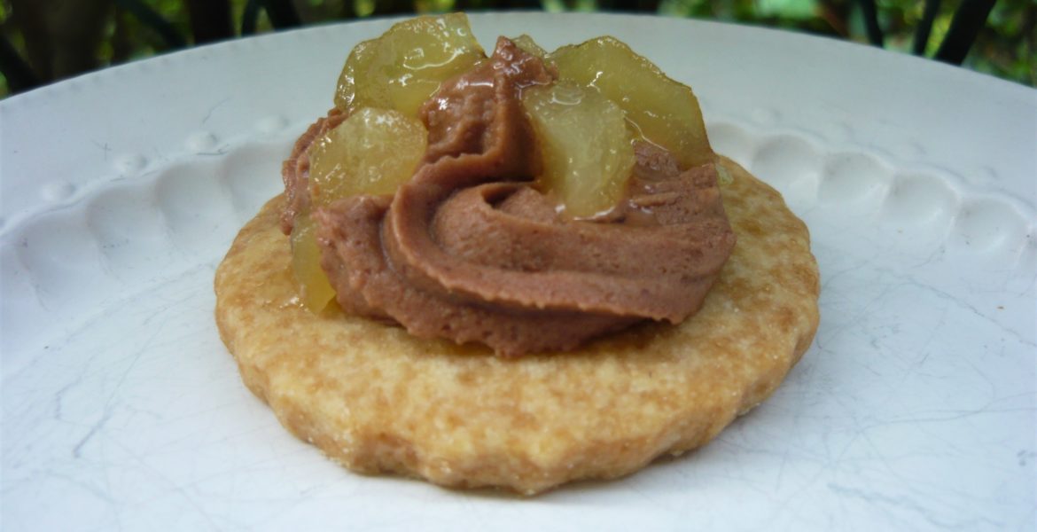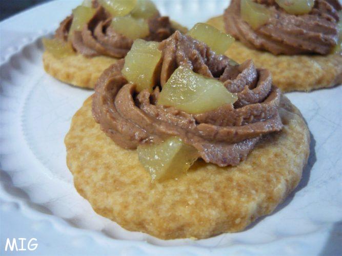 Préchauffez le four à 180° et enfournez pour 15 à 20 mn. Ils doivent commencer à blondir. Débarrassez-les sur une grille jusqu’à complet refroidissement avant de poser dessus un petit morceau du zeste d’orange confit, puis la ganache et, enfin, les dés de poire.