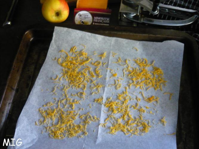 Préchauffez le four à 180°, râpez la mimolette, saupoudrez-en sur une plaque recouverte d’un papier sulfurisé et enfournez pour 4 mn. Faites glisser le papier sur une grille de pâtisserie et laissez refroidir.