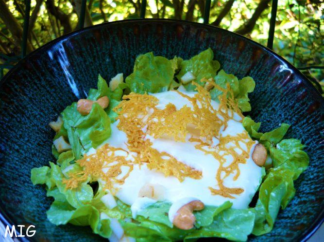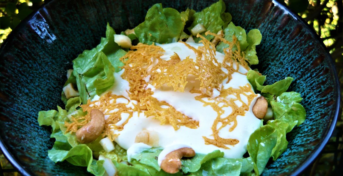 Répartissez la salade assaisonnée dans des coupelles ou grands bols, la pomme taillée en brunoise, quelques noix de cajou (je les divise en deux), la mousse de camembert et la tuile croustillante.