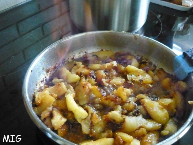 Stoppez la cuisson dès qu’elles ont une jolie couleur dorée même si elles restent fermes, elles vont terminer de cuire avec la galette, au four (vous pouvez, éventuellement, utiliser deux variétés de pommes, une qui se tient et une qui compote). Faîtes chauffer le Calvados et flambez-les (attention, on éteint toujours la hotte aspirante avant de flamber, ça a l’air évident mais j’aime autant le rappeler).