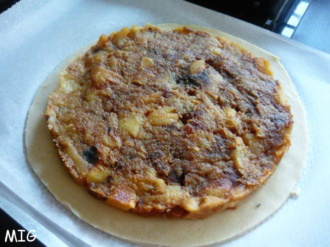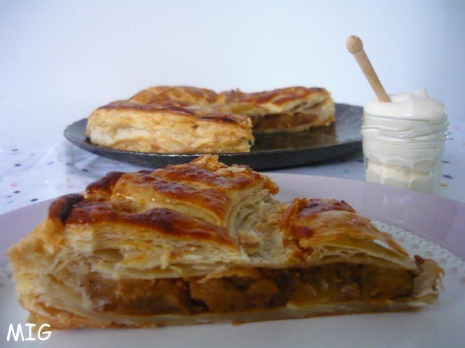A peine sortis des réveillons, PAF, c’est l’Epiphanie et donc la galette des rois. De retour de Normandie, j’ai été plus inspirée par les pommes et le calvados que par la frangipane (ou plutôt la crème d’amande pour moi), du coup, comme j’avais de la pâte feuilletée inversée au congélateur, j’ai bricolé en deux temps trois mouvements, une galette aux pommes flambées.