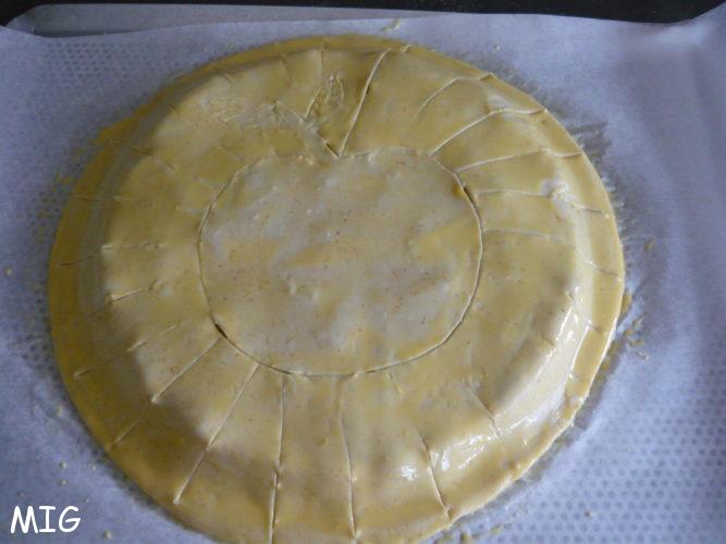 Badigeonnez, au pinceau, la galette avec le mélange jaune d’oeuf + 2/3 cuillerées à soupe de crème liquide puis, avec la pointe d’un couteau, dessinez des courbes ou tout autre motif sur la galette.