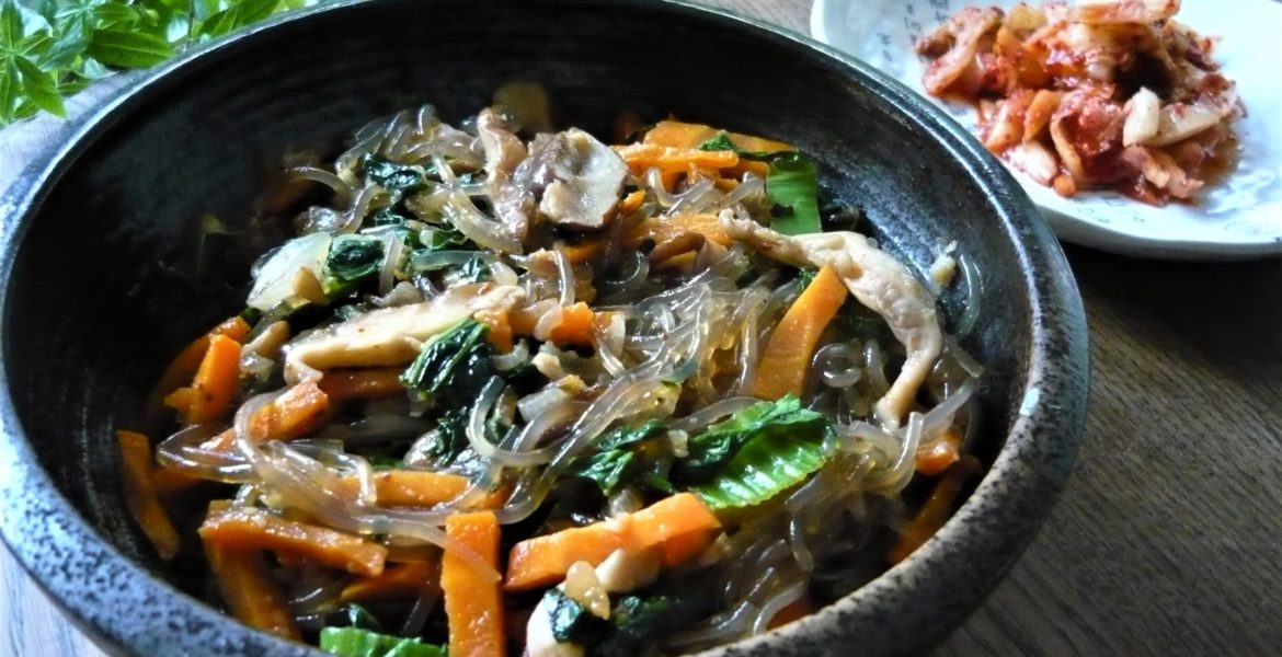 Depuis que je suis allée au Festival du Kimchi, à Paris, où il y avait de nombreux kiosques de street food coréenne, je ne pourrais consommer que ça. J’ai donc profité du présentiel pour faire une razzia dans une épicerie coréenne du deuxième arrondissement parisien et réalisé plusieurs recettes dont ce Japchaé aux Légumes. C’est un plat de nouilles de patate douce très populaire en Corée du Sud, anciennement réservé à la famille royale, dont il existe des versions avec viande (boeuf ou porc principalement) ou sans, comme ici.