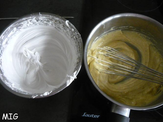 Incorporez, petit à petit, au fouet à main, la meringue à la crème pâtissière. Réservez au frigo jusqu’au moment de l’utilisation.