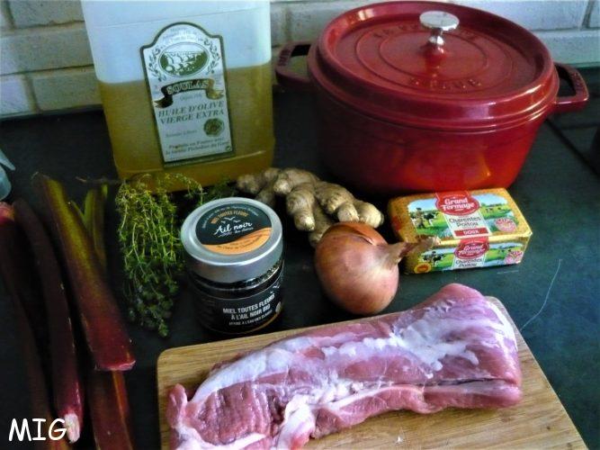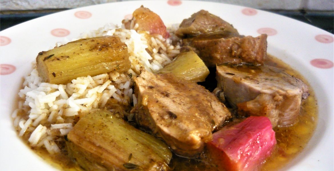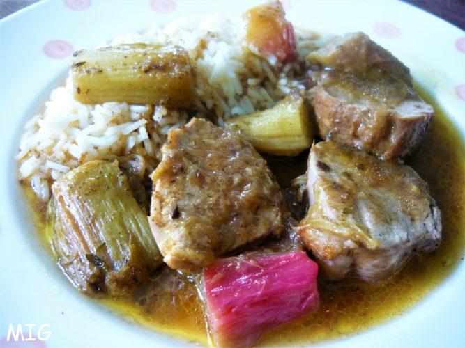 Environ 10 mn avant la fin de la cuisson, ajoutez la rhubarbe. Testez-la, elle doit être ferme et fondante mais ne pas se déliter. Dès que c’est le cas, sortez-là, délicatement, à la fourchette et réservez-la mais laissez environ 6 ou 7 morceaux dans la cocotte, jusqu’à ce qu’eux se délitent complètement, pour épaissir la sauce.