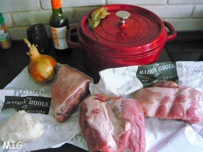 Lorsque c’est terminé, sortez les morceaux de la cocotte, faites couler le saindoux, remettez-les dans la cocotte avec l’oignon épluché, coupé grossièrement, le laurier, le vin blanc, l’eau. Poivrez (généreusement), couvrez, placez au four, à 110° pour environ 7 à 8 h, en les sortant régulièrement pour mélanger.