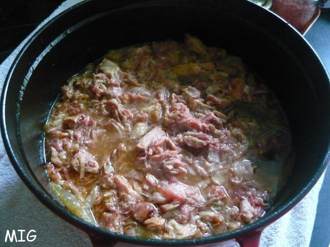 Lorsque la viande se détache et s’effiloche parfaitement, stoppez la cuisson, supprimez les couennes, os, et gros morceaux d’oignons.