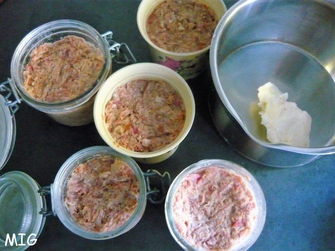Si, comme moi, vous avez aussi utilisé des pots de rillettes du commerce, en plastique, laissez redescendre la température avant de les remplir.