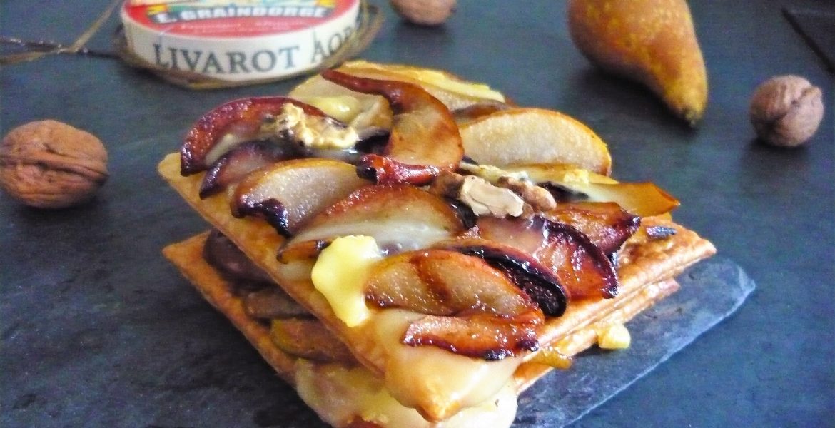 Lorsqu’on m’a proposé de créer une recette à partir d’un des quatre fromages AOP de Normandie, j’ai aussitôt eu envie d’associer « le colonel » (surnom donné au Livarot en raison des cinq bandelettes de roseaux qui l’entourent afin de l’empêcher de se tasser pendant l’affinage) à un fruit de saison : la poire, pour une recette aussi facile que rapide. Bonne pioche, ce Feuilleté aux Poires et au Livarot est vraiment crousti-gourmand.