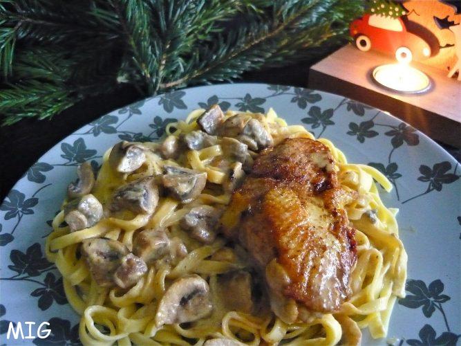 Répartissez les pâtes, égouttées, dans les assiettes, posez les filets dessus, recouvrez de la sauce et des champignons. Accompagnez d’un Cahors pour les amateurs de rouge, ou d’un Pacherenc du Vic-Bihl frais pour les amateurs de blanc, et, bien sûr, d’un bon pain pour la sauce.