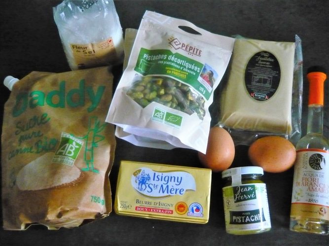 Bien évidemment, le goût dépend, avant tout, de la qualité des ingrédients, donc pour les pistaches, évitez, si vous pouvez, les californiennes jaunes et insipides qu’on trouve en hyper, pour l’eau de fleur d’oranger, j’en ai pris une dont le goût est assez puissant et concentré, donc je n’ai eu besoin que de deux cuillérées à soupe, et pour la pâte feuilletée, comme toujours, j’ai utilisé la Pâte François (l’Inversée, celle des galettes et tourtes mais même la classique sera parfaite).