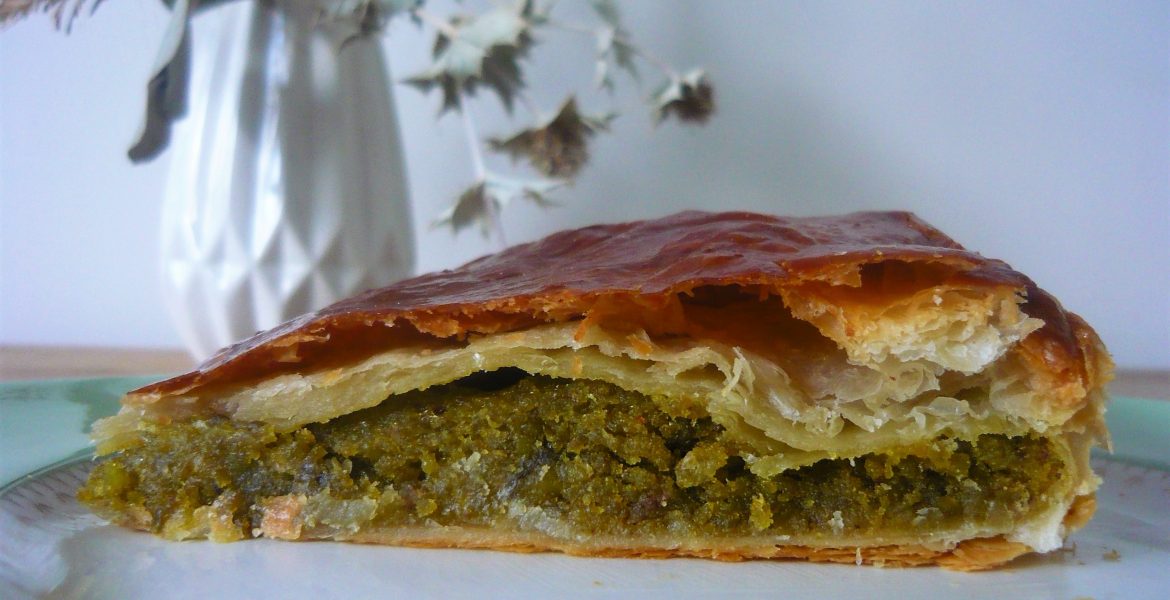 Si j’adore la version traditionnelle de la galette des rois, à la crème d’amande (la frangipane est arrivée après, pour raisons économiques ; l’amande, étant une matière première coûteuse, on a ajouté de la crème pâtissière à la crème d’amande et, ainsi, donné naissance à la frangipane), mon addiction à la pistache faisait que j’avais très très (mais alors très) envie d’une version pistachée, légèrement soutenue par la fleur d’oranger qui lui va si bien. Voici donc la recette de la Galette des Rois à la Pistache et à la Fleur d’Oranger, aux tonalités levantines.