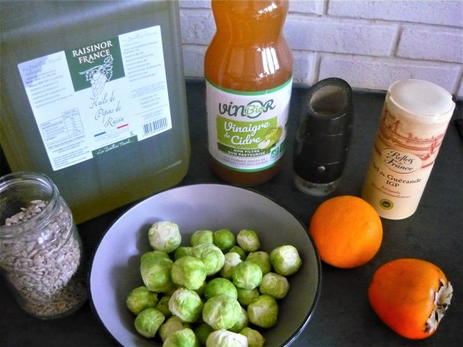 Je donne les quantités pour environ deux personnes, en gros, ce qui correspond à un petit kaki et une orange sanguine, après, vous multipliez. Bien évidemment, on utilise des choux de Bruxelles frais, les décongelés, en salade, je ne tente pas, mais si vous le faites, n’hésitez pas à me dire ce que ça donne, et si j’ai utilisé, pour le crispy, des graines de lin, c’est parce que c’est ce que j’avais sous la main. Si vous avez des graines de courges, des amandes, des cacahuètes, des noisettes, ça ira aussi (peut-être pas tout en même temps).