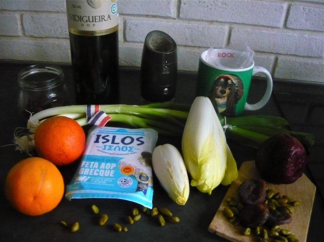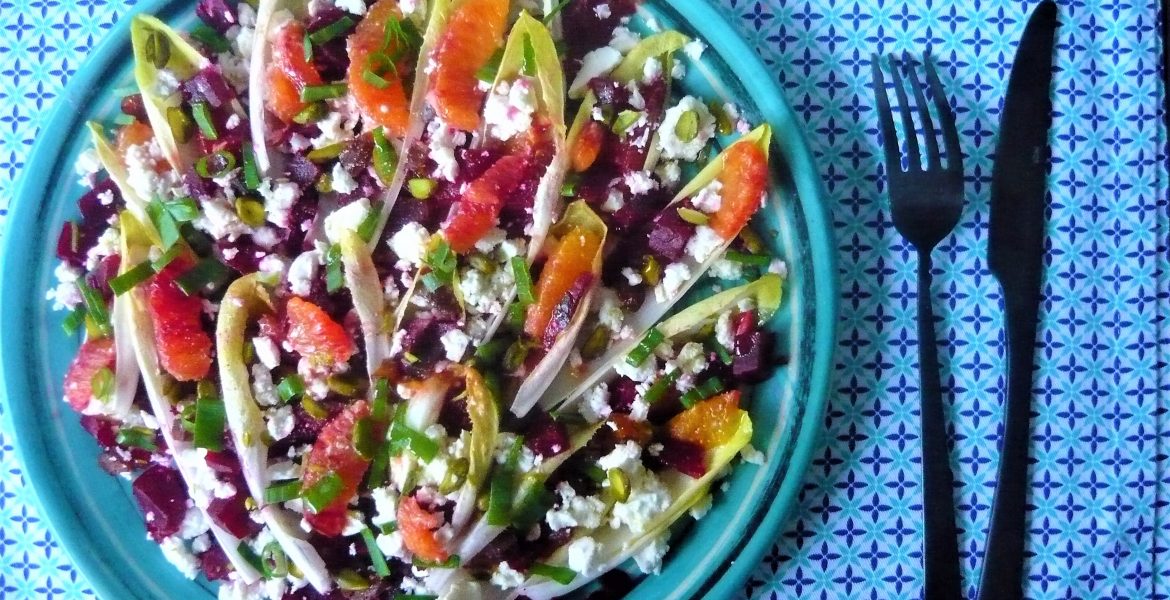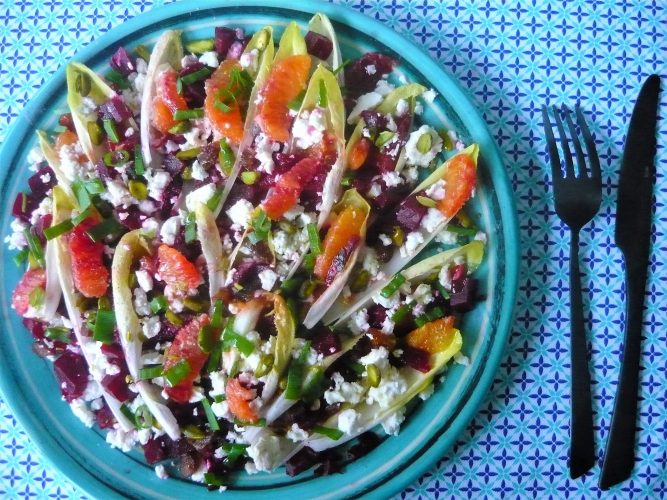 Détachez les feuilles des endives puis répartissez-les dans les assiettes ou le plat de service avant de les remplir des oranges (vous pouvez les recouper en deux), betteraves, abricot , arrosez avec la sauce, émiettez grossièrement la feta au dessus, parsemez de pistaches concassées et de cébette ciselée. Saupoudrez d’une pincée de fleur de sel (ayez la main légère, la feta sale déjà).
