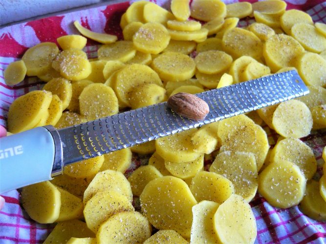 Epluchez, rincez, et coupez ensuite les pommes de terre en rondelles de 3 mm d’épaisseur (le mieux étant de le faire à la mandoline) avant de les plonger dans une grande casserole d’eau bouillante salée pendant 2 mn tout pile, pour faire ressortir l’amidon, ce qui leur permettra de se coller entre elles. Débarrassez (sans rincer surtout), sur un linge propre (on précise toujours « propre » dans les recettes pour ceux qui seraient tenter d’utiliser leur serpillère), ne les séchez pas.