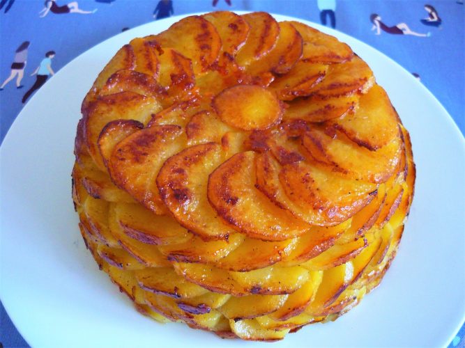 Saupoudrez de comté râpé jusqu’à environ 2 cm des bords, pour éviter des coulures de fromage au démoulage. Pour la seconde couche, faîtes de même mais en inversant le sens des pommes pommes de terre qui doivent se chevaucher a contrario (le premier qui me dit qu’il y a un accent grave sur le « a » me copiera 100 fois les pages roses du Larousse). Répétez l’opération encore 4 fois (il faut 5 couches de pommes de terre, et ça tombe pile).