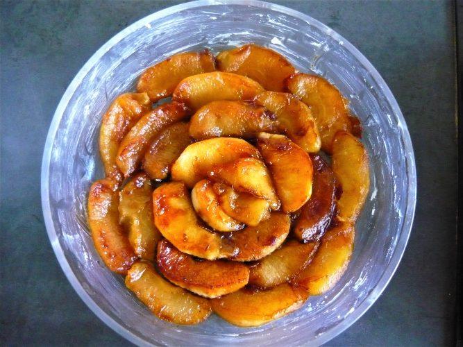 Beurrez votre moule et tapissez le fond de tranches de pommes caramélisées en les collant bien les unes aux autres ou en les faisant se chevaucher un peu pour qu’il n’y ait pas d’interstice où la pâte passerait.