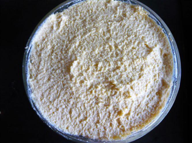 Dans le bol du robot muni du fouet, ou dans un saladier, comme moi, fouettez le beurre et la moitié du sucre jusqu’à ce que l’appareil soit léger avant d’incorporer, petit à petit, les jaunes d’oeuf, l’extrait de vanille et la ricotta (ou cottage cheese) en fouettant puis incorporez la semoule (ou polenta), toujours en fouettant.