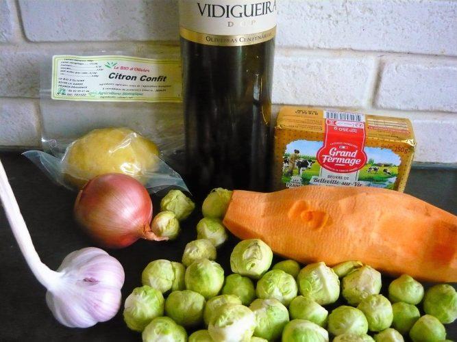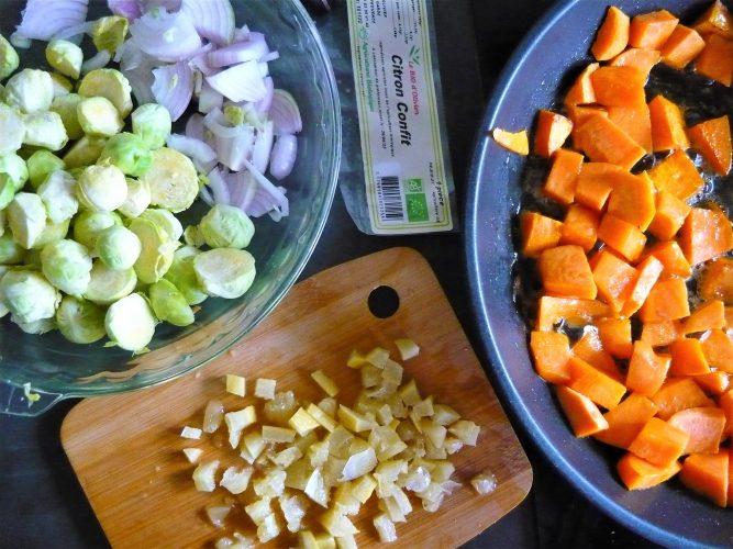 Cette poêlée de choux de Bruxelles et patates douces, qui plait aux petits comme aux grands, nous permet de profiter jusqu’au bout de la très grande variété de légumes que nous offre l’hiver, sans passer des heures en cuisine. Les petits dés de citron confit lui ajoutent juste le léger coup de peps qu’il faut pour en faire un plat aussi tonique que gourmand.