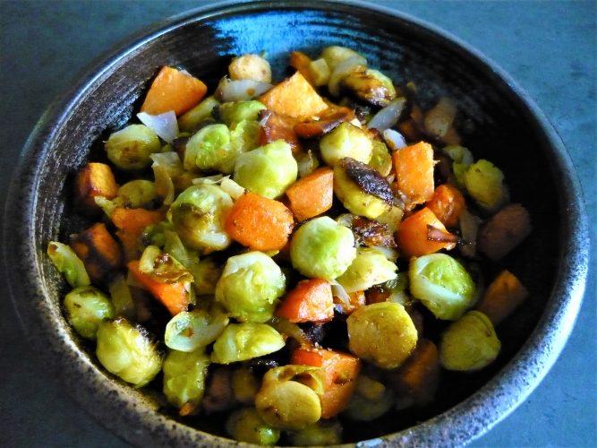 Faites fondre le beurre avec trois cuillérées à soupe d’huile, dans une poêle avant d’y faire revenir la patate douce à feu moyen (5/10). Dès que les morceaux commencent à dorer et s’assouplir un peu, ajoutez les choux de Bruxelles, l’ail et l’oignon. Laissez cuire jusqu’à ce que la lame d’un couteau pénètre sans résistance dans les patates. Pour la cuisson des choux de Bruxelles, c’est à vous de voir, je les préfère légèrement al dente, certains préfèrent plus cuits.