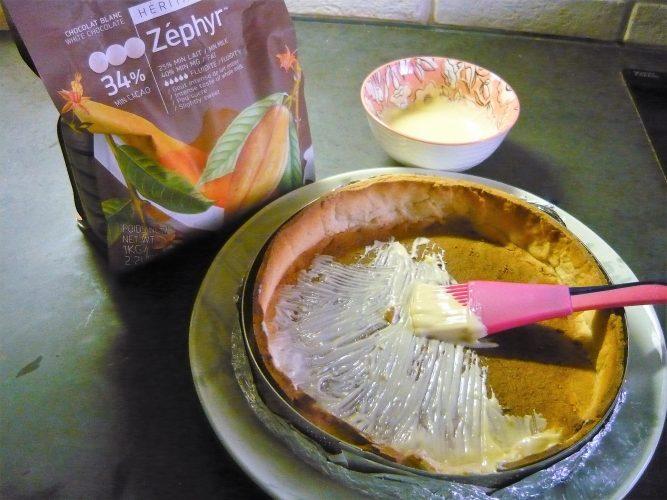 Ce que la recette originale n’indique pas, mais que j’ai fait, c’est de chablonner le fond de tarte. Chablonner signifie, enduire un fond de tarte, un biscuit croustillant, de chocolat noir ou blanc (selon les autres ingrédients), qui, en refroidissant, va durcir et imperméabiliser la partie qui doit rester croustillante et, ainsi, ne ramollira pas au contact de la crème.