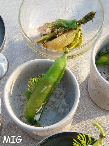 - Cosse de petits pois comme un roudoudou (une super idée à retenir pour des apéros originaux), tartare de langoustine au piment fermenté, crème aigre, verveine en poudre