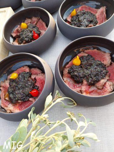 Tiradido de boeuf au pesto d’algues et fromage de la ferme, laits près verts.