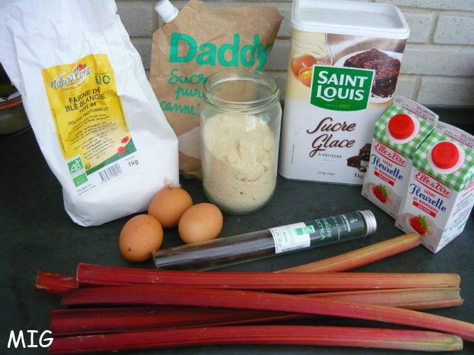 Benoît Castel conseille de préparer l’appareil la veille, et de le placer au frigo, et de faire dégorger la rhubarbe au moins une heure, coupée, avec un peu de sucre ; ça aussi je l’ai fait la veille.