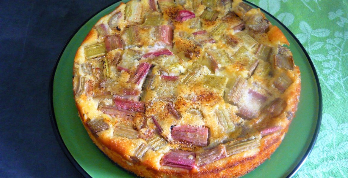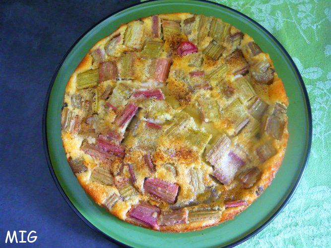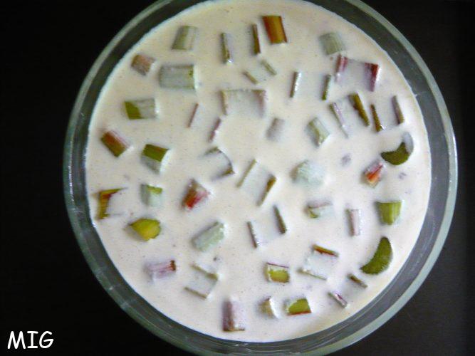 Versez un peu d’appareil dans un moule beurré, répartissez la rhubarbe (qui rendu de l’eau), versez le reste de l’appareil et enfournez environ 45 à 50 mn )à 165°.