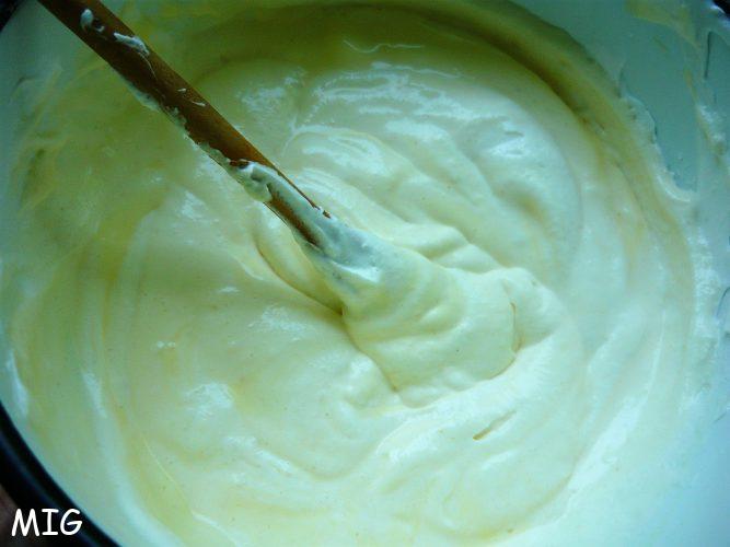 Pendant ce temps, préparez la fausse chiboust en mélangeant la crème fraîche, les jaunes d’oeufs, la Maïzena et le sucre vanillé.