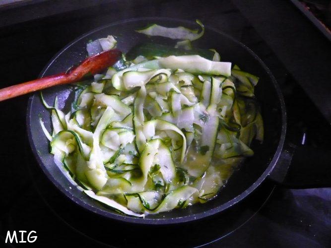 Pendant ce temps, à l’aide d’un économe, coupez des tagliatelles de courgettes, faites-les revenir dans un peu d’huile d’olive, à feu moyen (elles doivent rester al dente), salez, poivrez, arrosez du jus du citron que vous aurez utilisé pour les zestes.