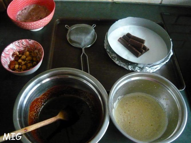 La cheffe indique, pour ces quantités, d’utiliser un cercle ou moule de 24 à 28 cm de diamètre. Ca m’a semblé un peu trop grand pour un gâteau qui gagne en gourmandise en même temps qu’il gagne à être haut. J’ai donc utilisé un cercle de 20 cm X 3,5 de hauteur. Un cercle de 24, 26 ou 28 cm, donnera forcément un gâteau plus plat, qui cuira plus et sera donc plus sec, ce qui n’est pas la qualité première d’un fondant.