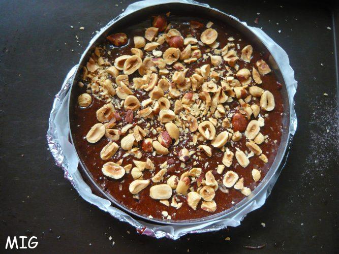 Dans un troisième bol, tamisez la farine et le cacao, ensemble, avant des les ajouter au reste de la préparation. Terminez avec la pincé de sel. Mélangez bien le tout, versez dans le cercle ou moule, répartissez les noisettes grossièrement concassées et enfournez pendant 6 mn.