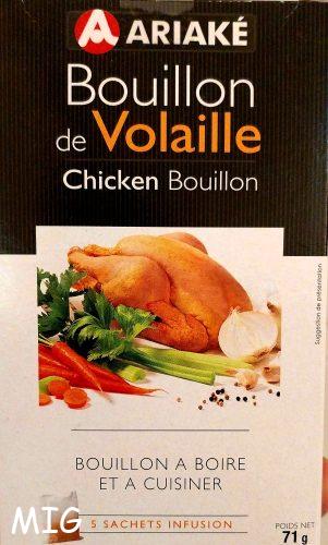 Concernant le(s) bouillon(s), dont vous ne voyez sur la photo que le sachet, sous le piment, je n’utilise pas de cubes, même bio, car ils sont composés majoritairement de sel, finalement très cher au kilo. Je préfère largement, à défaut de fait-maison, la marque ci-dessous, sous forme d’infusion, qu’on trouve au rayon Soupes des GMS (à côté des briques et soupes instantanées, pas à côté des cubes, qui eux, sont, en toute logique, à côté du sel…) :